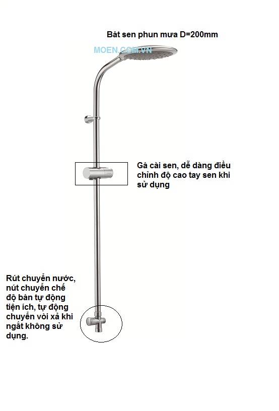 Cần sen tắm nóng lạnh kết hợp 2268: Bao gồm rút chuyển nước, gá trượt sen và đầu sen phun mưa Ø200mm, chưa bao gồm củ sen tắm.