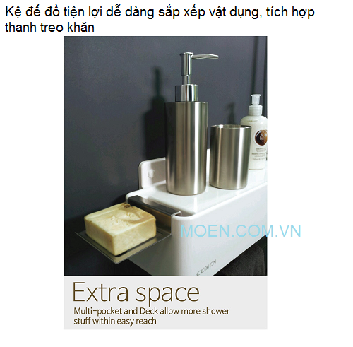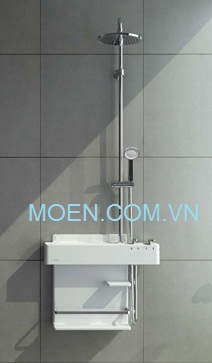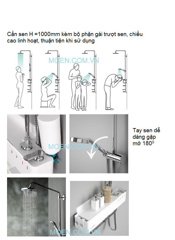 Sen câyBao gồm bát sen tròn; thân và gá trượt sen; dây và tay sen, tích hợp kệ để hóa mỹ phẩm bằng plastic phù hợp cho không gian hẹp, gia tăng không gian lưu trữ.