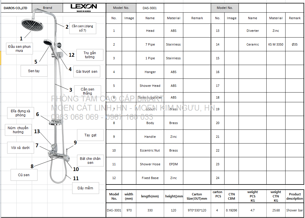 Sen cây tắm nóng lạnh Bao gồm bát sen tròn 18cm; thân và gá trượt sen; củ sen, dây và tay sen, vòi xả dưới, đĩa xà phòng