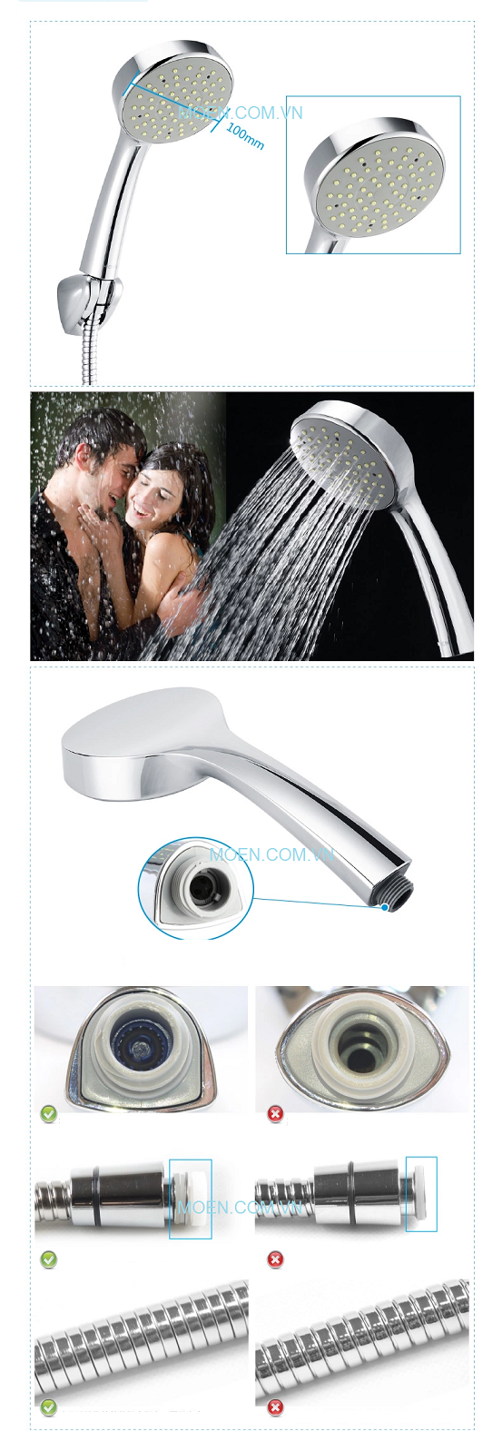 - Đầu vòi được thiết kế đặc biệt bằng nhựa cao cấp và tạo bọt trong dòng chẩy giúp tiết kiệm nước và tạo cảm giác êm ái.