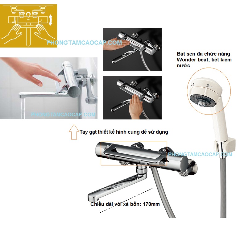 - Sen tắm nhiệt độ Nhật Bản, sử dụng công nghệ van nhiệt SMA, kèm bát sen nhựa với đầu phun mạnh mẽ, đa chức năng Wonder Beat,