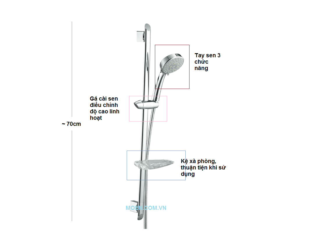 Bộ sản phẩm bao gồm thanh trượt, gá cài sen, dây và tay sen, kệ xà phòng