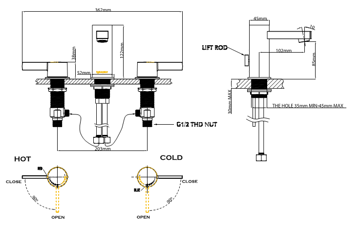 Vòi nóng lạnh Moen hai tay chỉnh bao gồm 2 tay gạt (hoặc tay vặn) có tác dụng để mở nước và chỉnh nhiệt độ thông qua việc điều chỉnh lưu lượng nước nóng, nước lạnh qua vòi.
